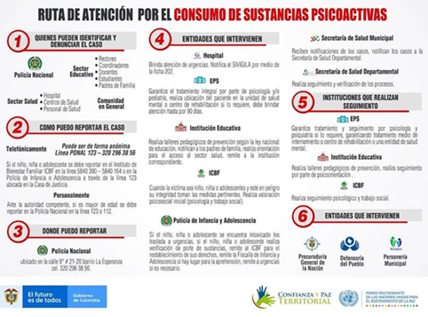 Línea Psicoactiva o Línea SPA (01 8000 11 21 37): Esta línea ofrece servicios de información, orientación e intervención breve para la atención del consumo de sustancias psicoactivas. Aquí los ciudadanos pueden ser escuchados de manera confidencial: El equipo interdisciplinario tranquiliza y estimula la confianza de la persona que se encuentra afectada por una crisis emocional. La línea atiende todos los días de 8:00 a.m. a 8:00 p.m. Se debe marcar desde un teléfono fijo.